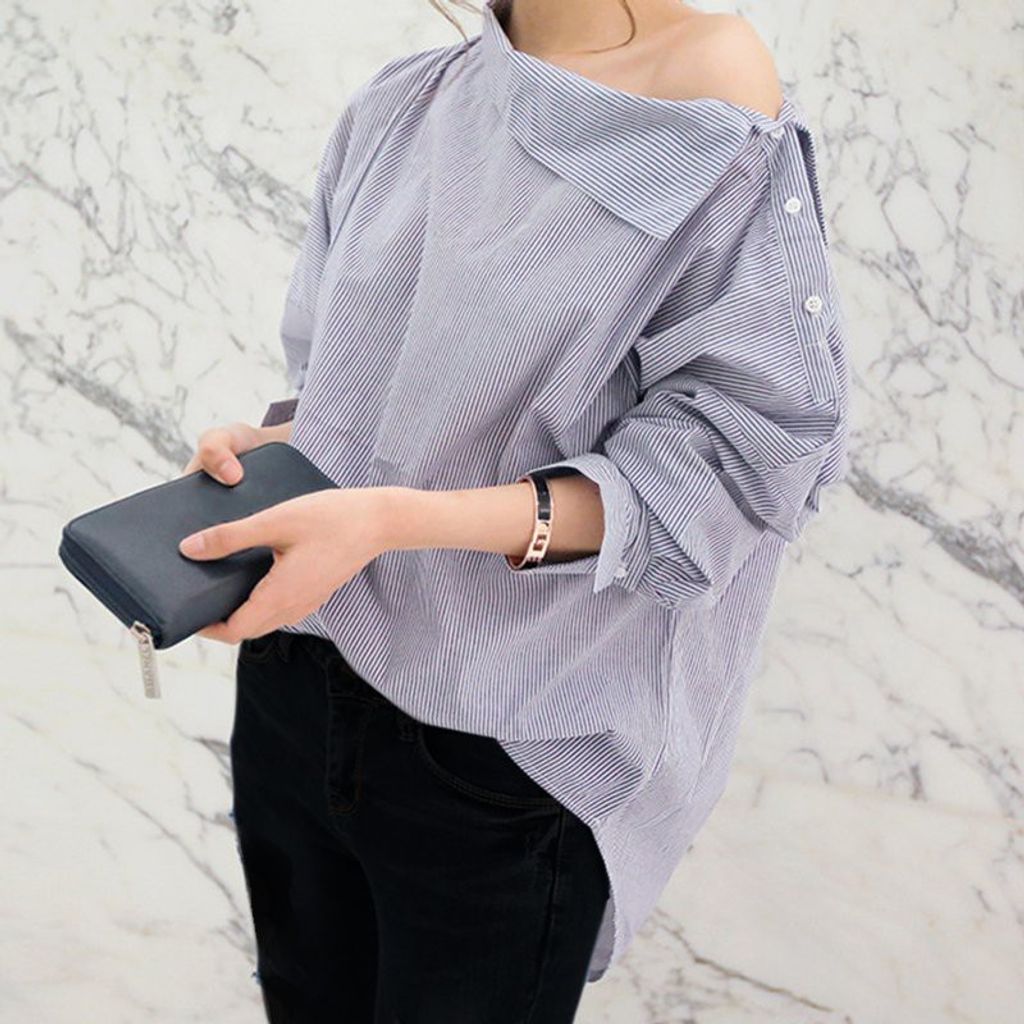 Women Casual Long Sleeve Oblique Collar Striped Loose Blouse
