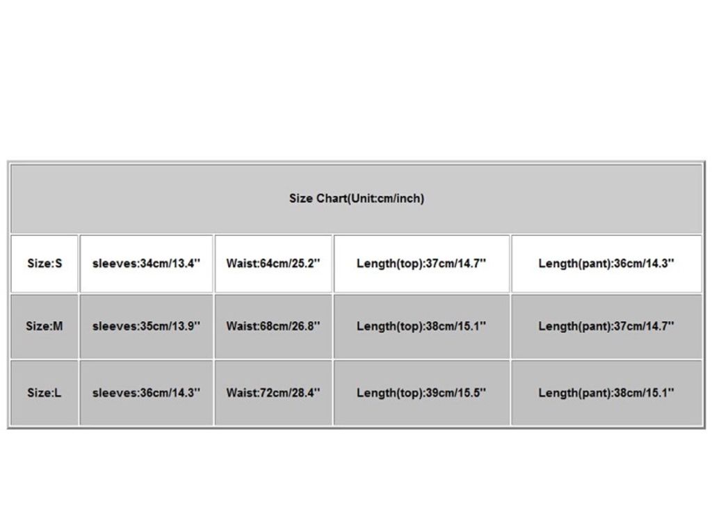Size:S sleeves:34cm/13.4'' Waist:64cm/25.2'' Length(top):37cm/14.7'' Length(pant):36cm/14.3''