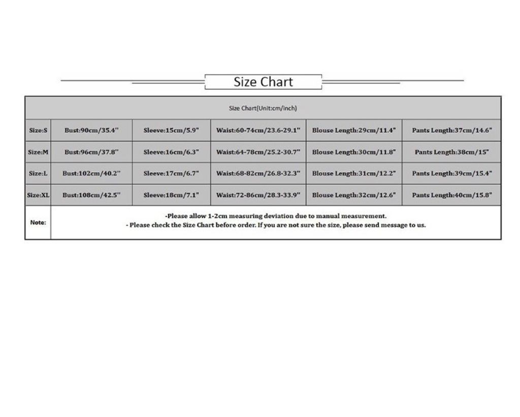 Size:S  Bust:90cm/35.4''  Sleeve:15cm/5.9"  Waist:60-74cm/23.6-29.1''  Blouse Length:29cm/11.4"   Pants Length:37cm/14.6"
